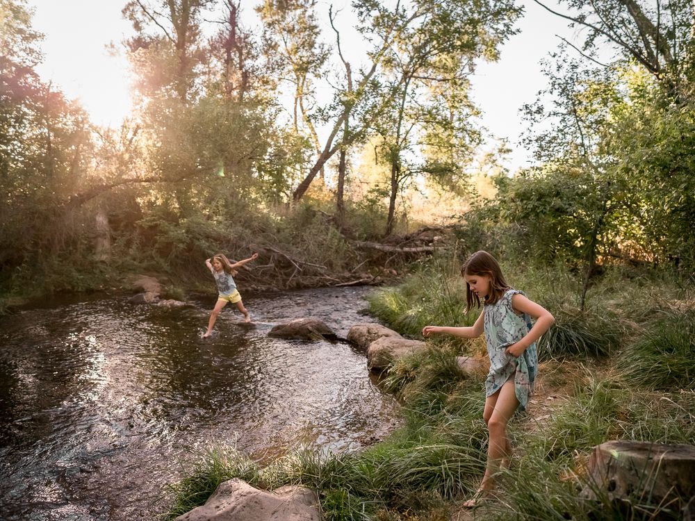 These two friends enjoy playing in and around the water of this neighborhood creek, near Boulder Colorado.