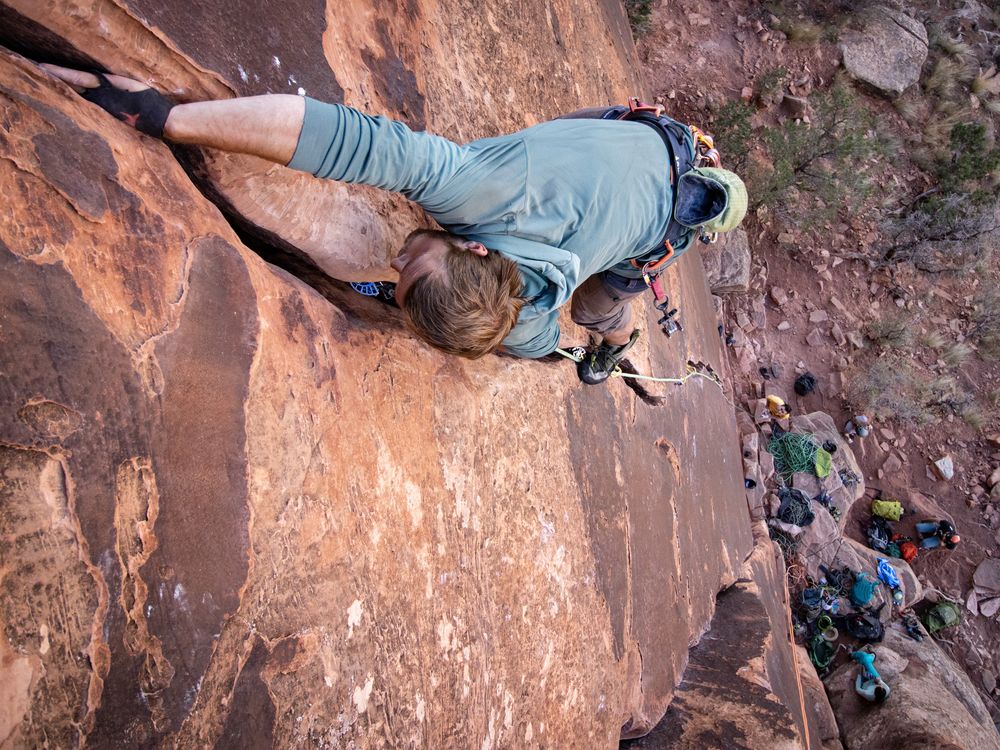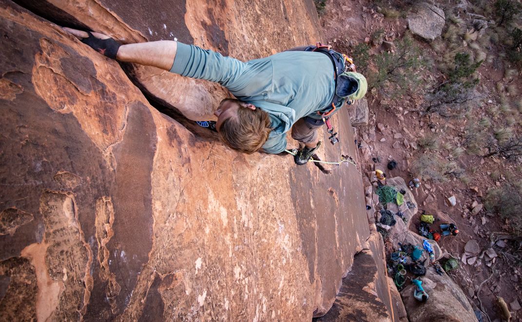Graham extends to his maximum reach, searching for a secure jam in a convoluted crack.