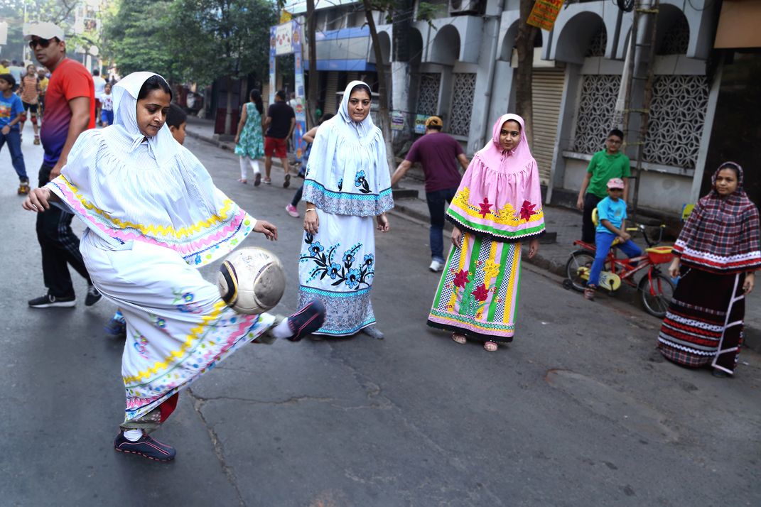 The photo is showing that "The sleeping childhood is preserved in the heart of every parents" On one Sunday, in the early morning, when i moving with camera for street photography through the most important road ( in week day) of Kolkata , India , I saw the local people are make the road as play ground , and playing group wise according to their sex and age, for that morning.I have not miss the chance to take this short.