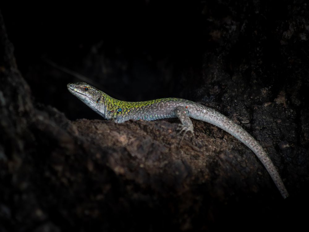 This photograph captures a full-body profile of a Podarcis lizard resting at the entrance of its den, carved into the trunk of a tree in the "Ciane's river" reserve, in Sicily. The animal is perfectly positioned along the edge of the hollow, its slender form outlined against the dark interior. The contrast between the textured bark, the shadowed cavity, and the poised reptile creates a scene that feels sculpted by nature itself. This moment reflects the quiet elegance of reptilian behavior—alert, still, and seamlessly integrated into its environment.