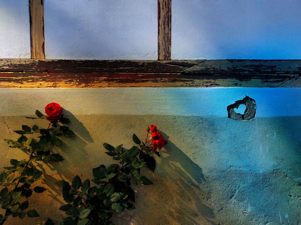 In a quiet backyard in the hills of Sikkim, red roses climb an old wall. A broken patch on the wall forms a small heart shape turning this ordinary corner into a gentle, poetic moment.