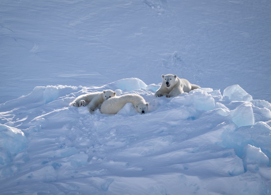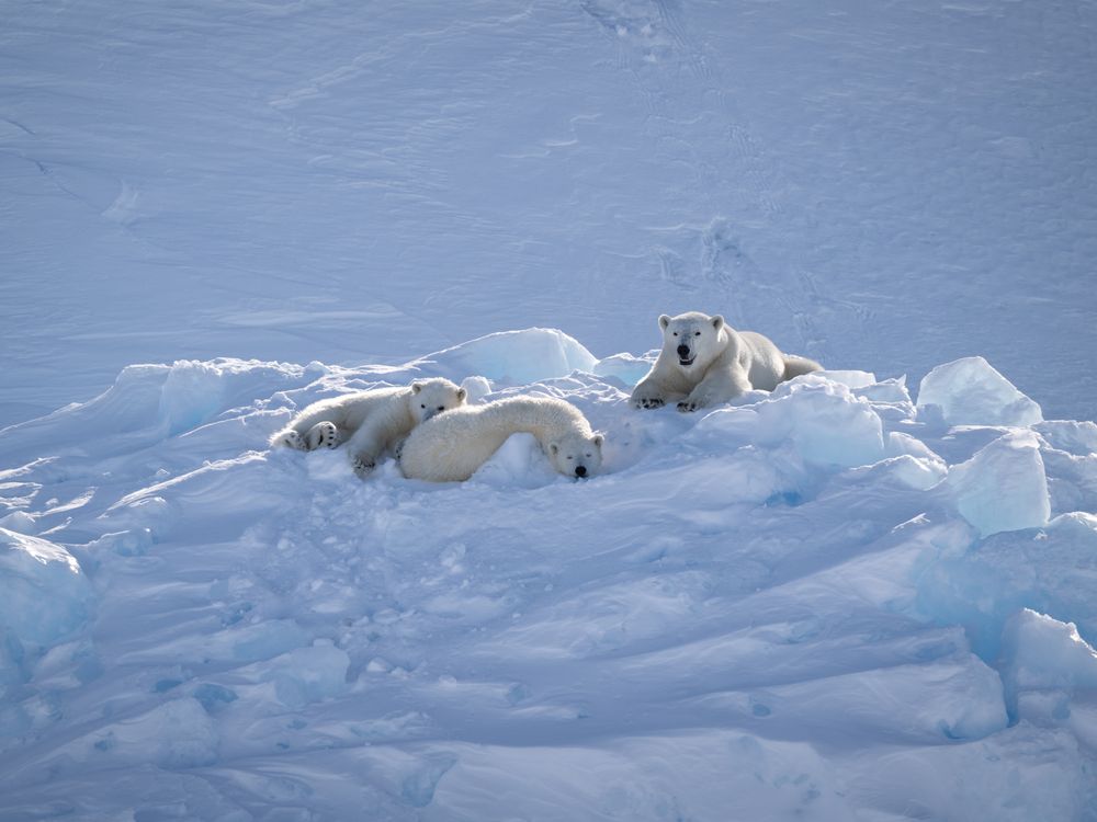 This image shows the happy polar bear mom who was watching her two young resting cubs on the icebergs. The cold ice is polar bear's happy land. The warm climate doesn't help the polar bears. We have to respect and preserve their land.