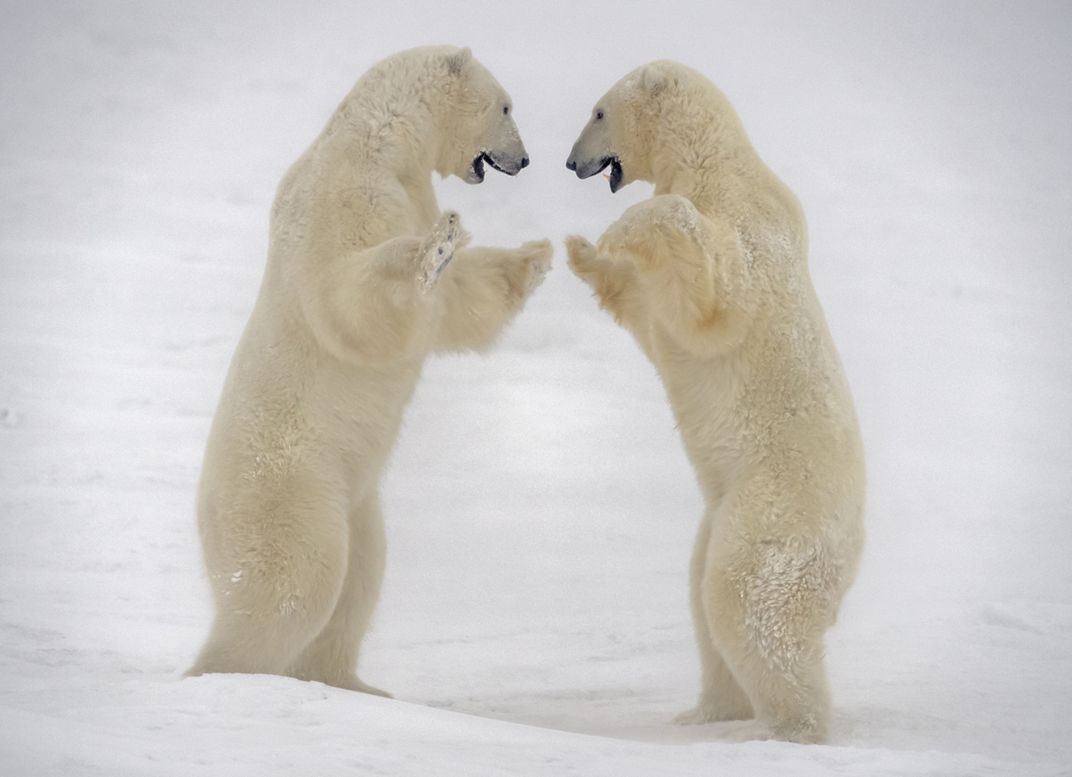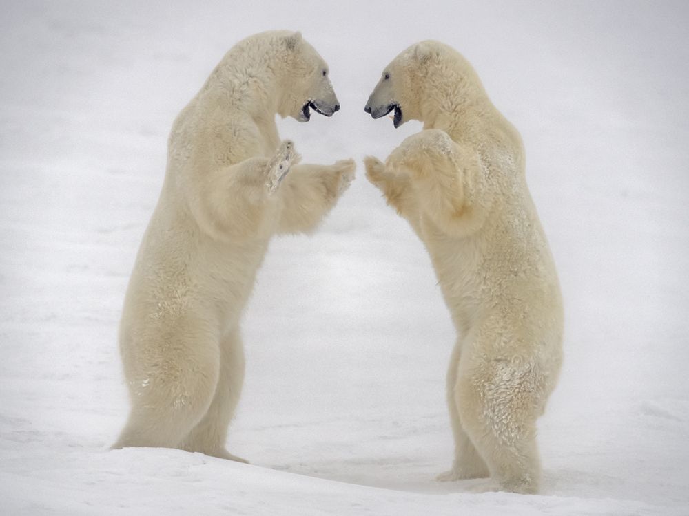 The image was taken in Nov. 2019 in Churchill, Canada. Two polar bears were standing up, fighting on the snow-covered ground.