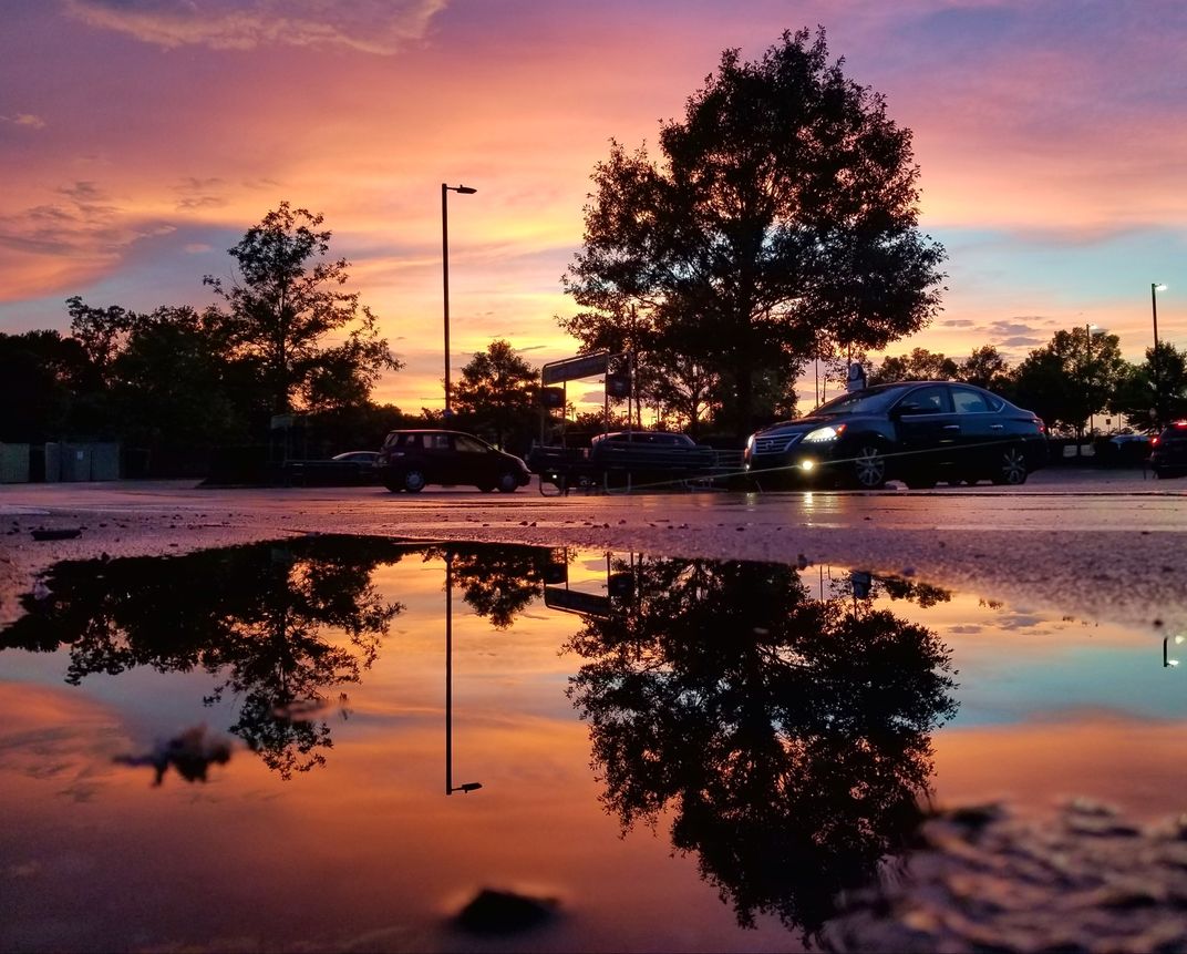 A sunset reflected in a puddle after rainfall in a parking lot.