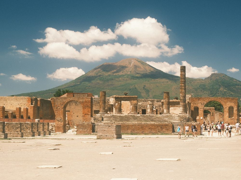 A photo taken from the ruins of Pompeii. Features Mount Vesuvius from the ruins it created.