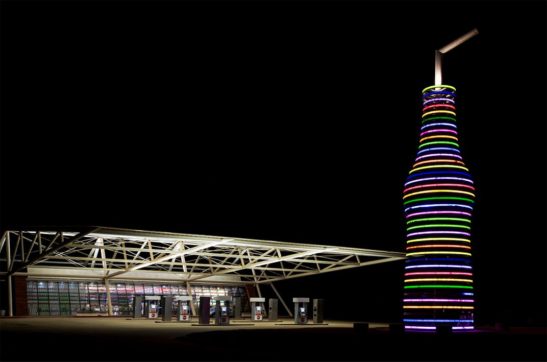 Pops 66 is a landmark diner & gas station with hundreds of sodas, and a 66-ft.-tall soda bottle out front on Route 66 in Arcadia, Oklahoma.