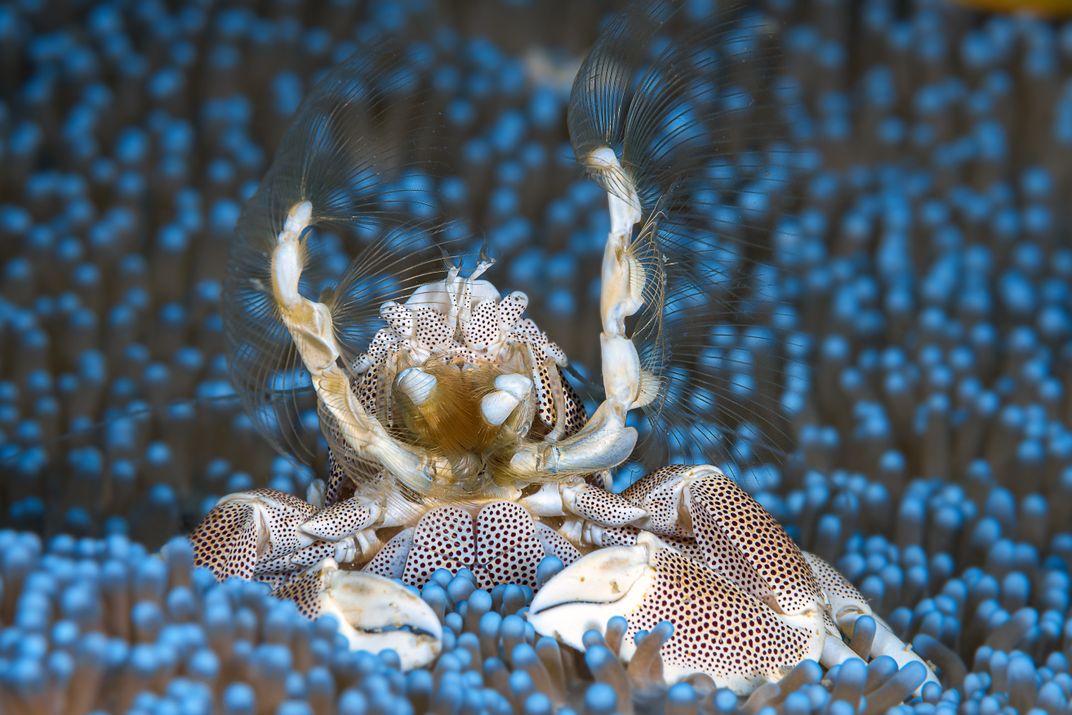 The picture shows a porcelain crab standing in front of its blue anemone and waving its nets to capture the plankton it feeds on. The blue color of the anemone contrasts well with the light brown of the carapace
