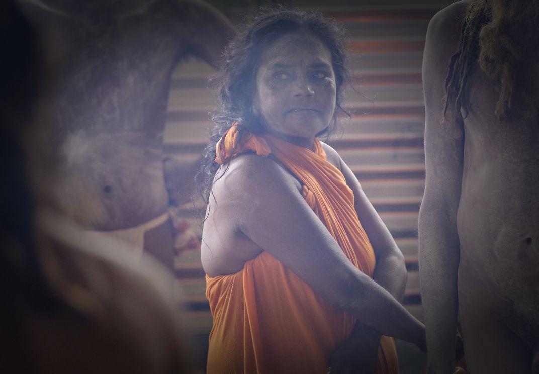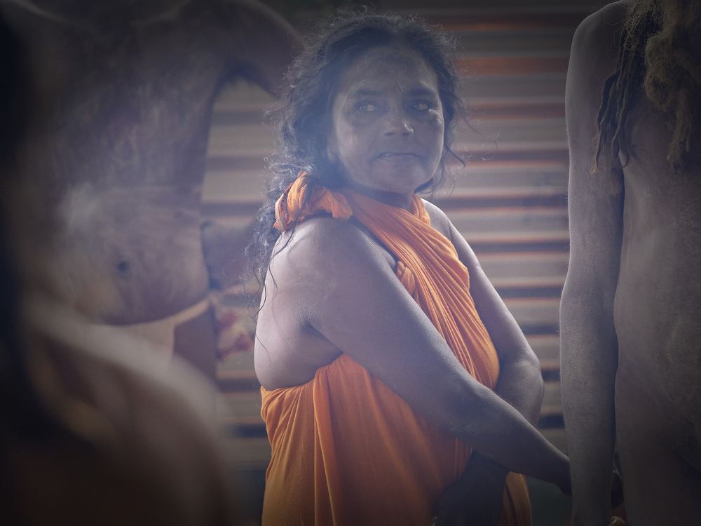 This is a portrait of a Hindu nun standing in a group of Naga sadhus in a camp during the Kumbha fair in Prayagraj in India.