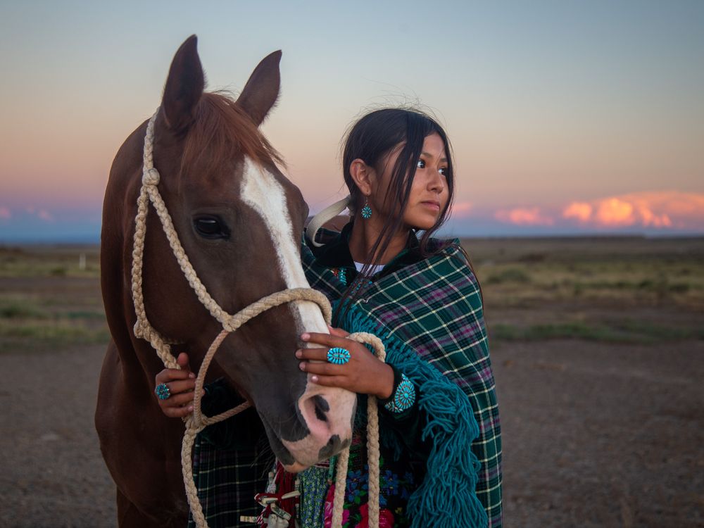 DelShay Henio leads her horse across the arid land of her family's ranch on the Navajo Nation in northern New Mexico.