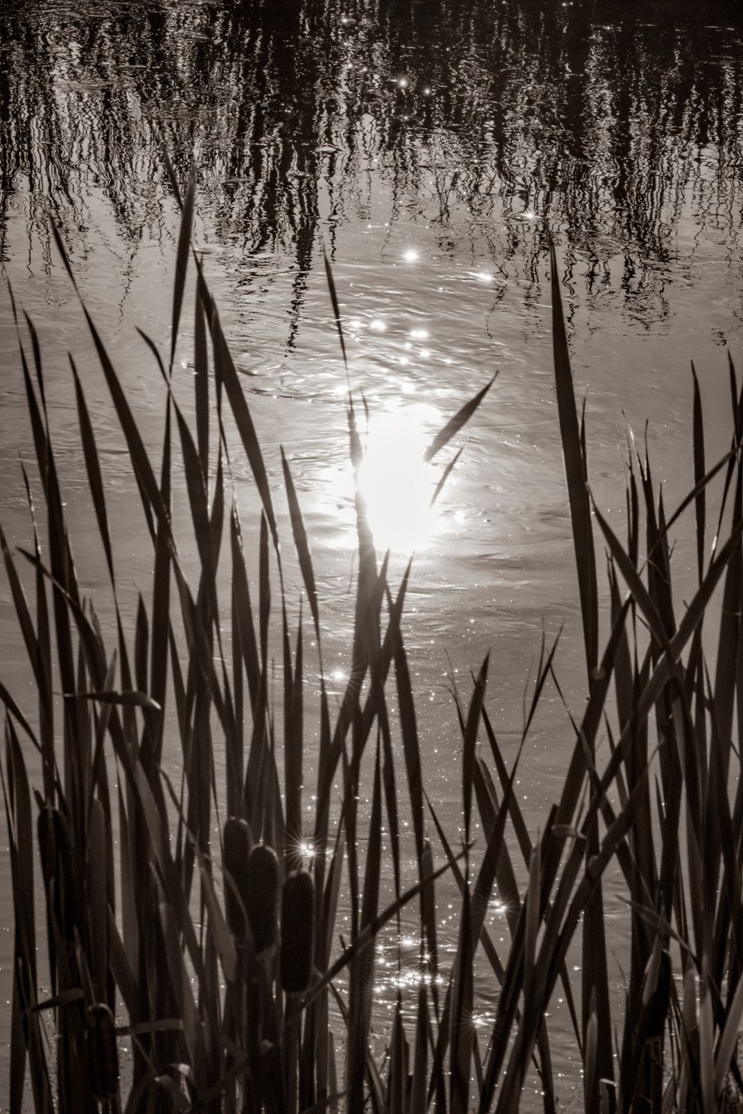 Sunlight glitters on the water behind a dark, silhouetted curtain of reeds and cattails, creating a striking contrast and a sense of depth in this black and white pond scene.