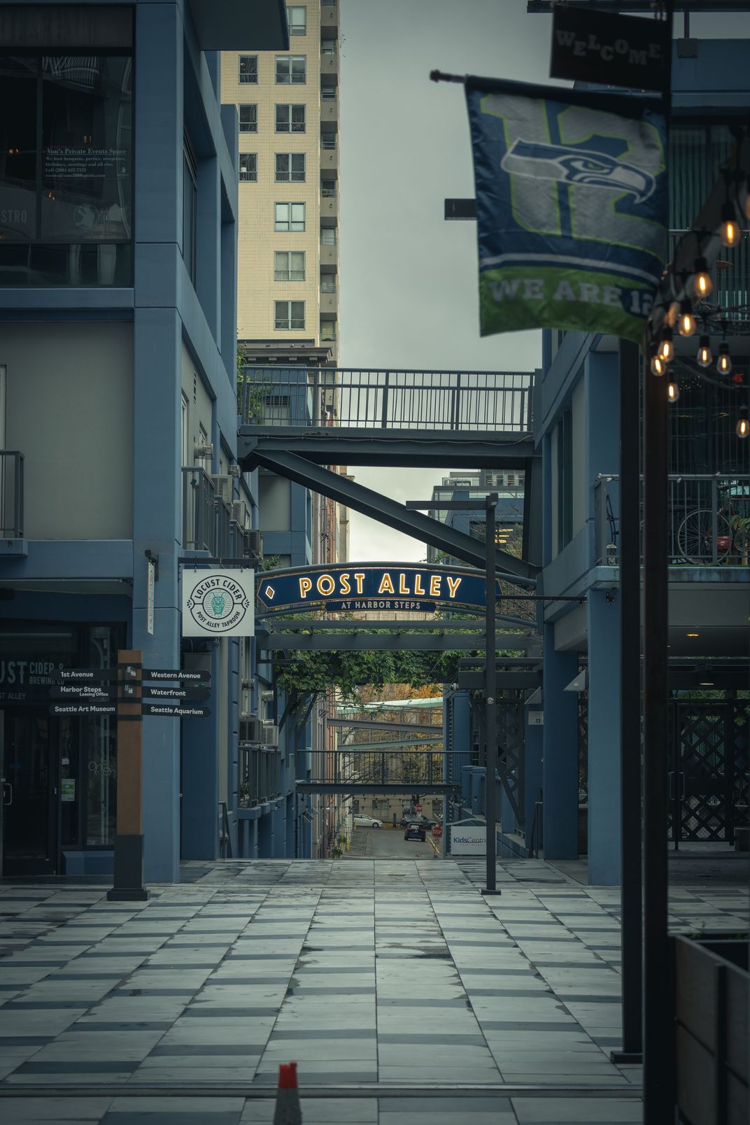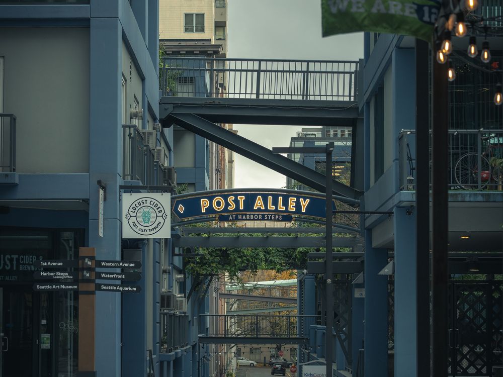 A gloomy view of post alley in Seattle after the first major rainstorm of fall passed through.