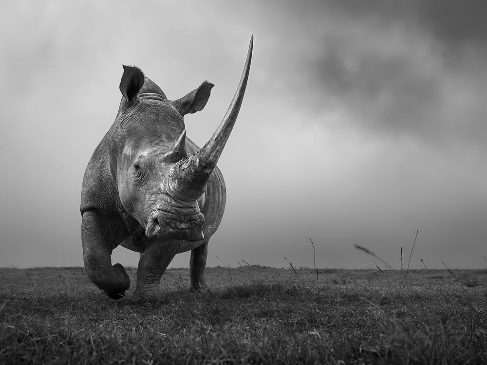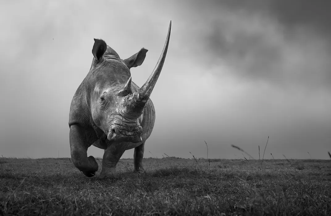 The rhino's horn, pointing skyward like a weapon or scepter, symbolizes the ancient and enduring nature of power that has commanded reverence throughout history.