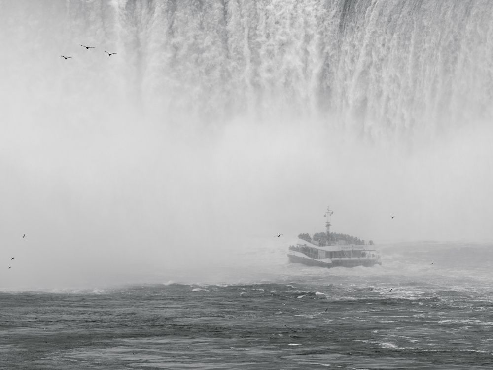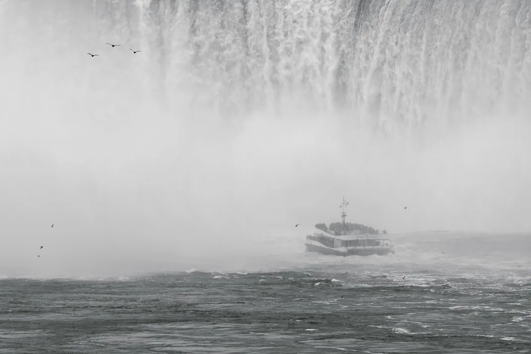 Edited in black and white, this scene at Niagara Falls reduces everything to pure contrast—mist, water, and motion. A tour boat pushes toward the roaring wall of water, capturing the raw power of this American landmark.