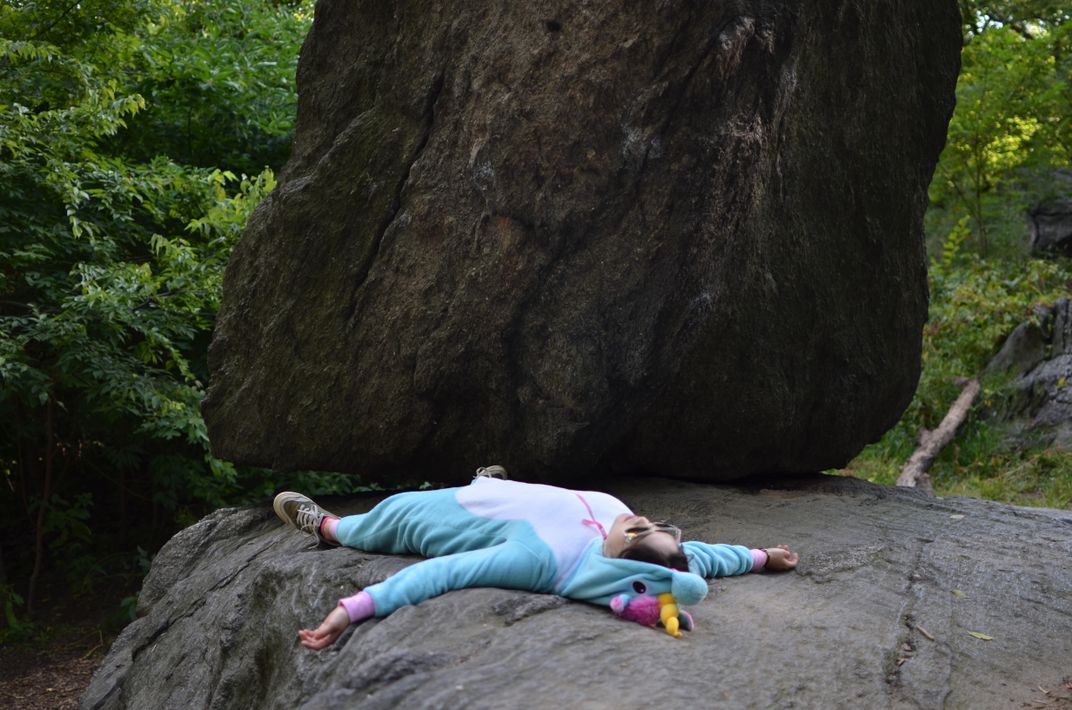 We were walking around central park and found this two huge stone, we felt some powers from the place, she started laying down, but if you see the bottom of the stone, there are not wide surface facing to the bottom part.
