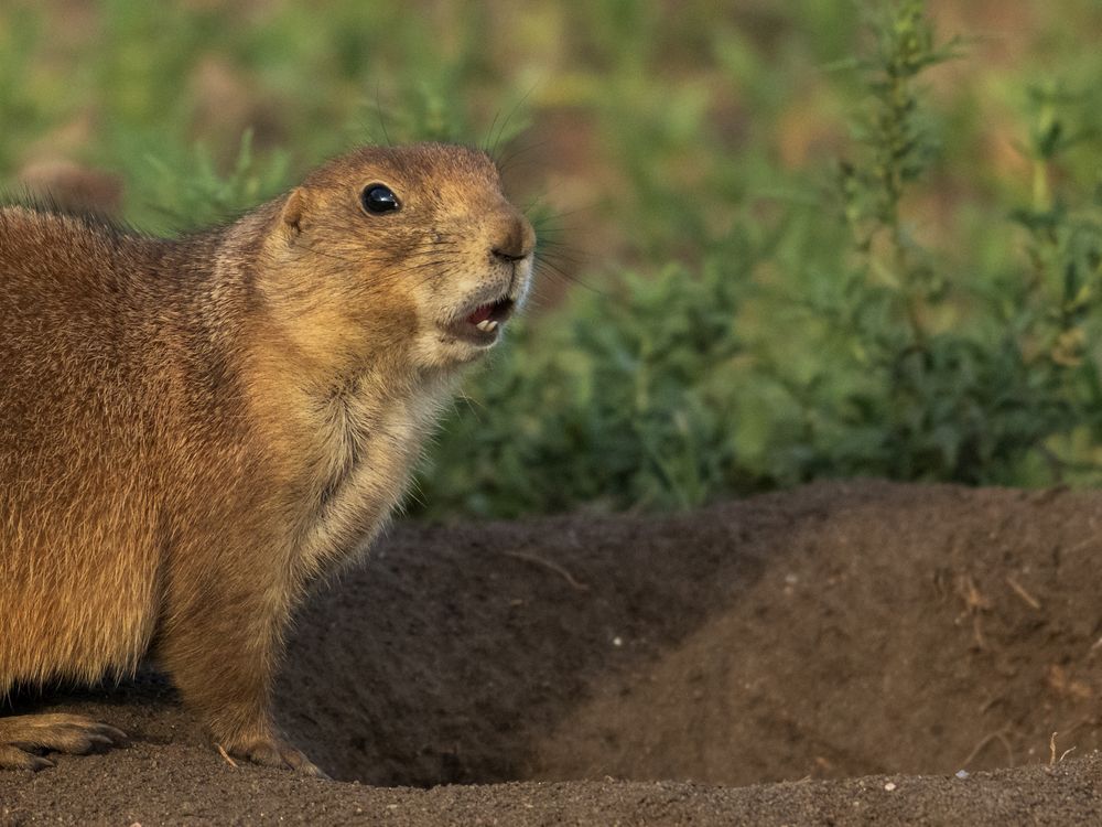 At Custer State Park, prairie dogs live in burrows in prairie dog "towns." When a potential threat (or photographer) approaches, prairie dogs bark to alert each other. This prairie dog was doing just that at the entrance to a burrow, so it could make a quick retreat, if necessary.