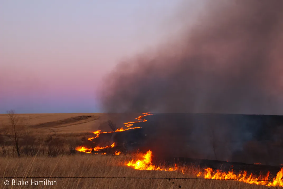 Prairie Fire in the flint hills of Kansas at sunset.