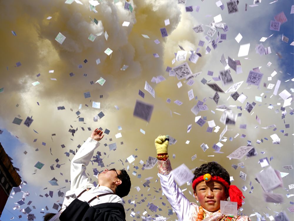 Tibetans held Fengma flags in their hands to pray for good luck.