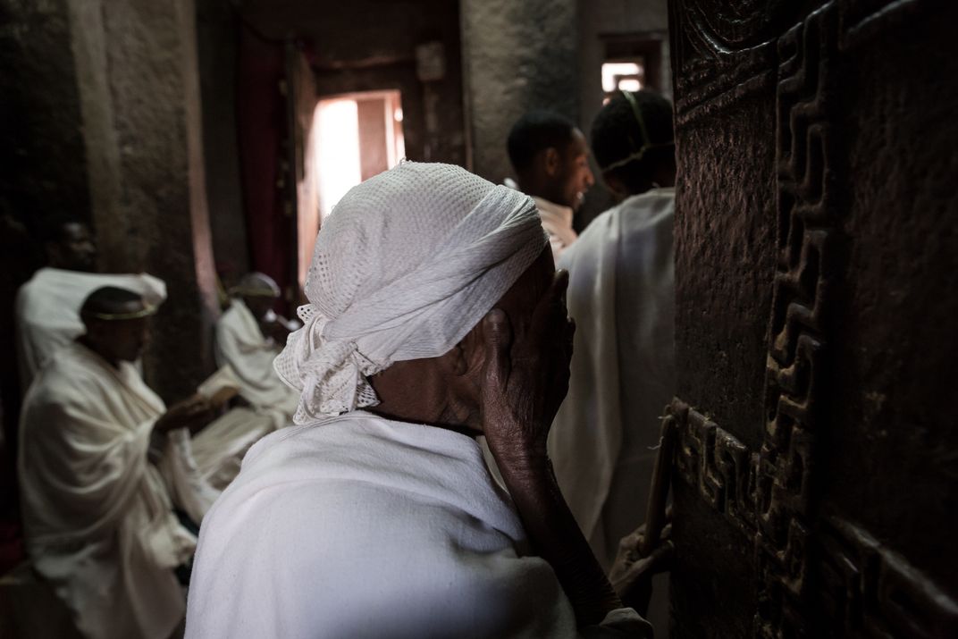 An Ethiopian lady is praying in the rock-hewn church on Easter. The churches in Lalibela were carved out of the mountain rock on all four sides. Today, these churches remain to be a religious center, as sacred to the people of Ethiopia as hundreds of years ago when they were carved.