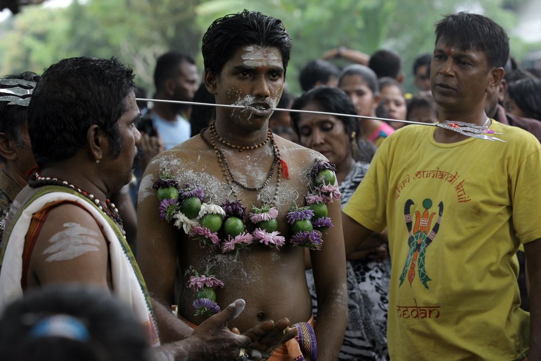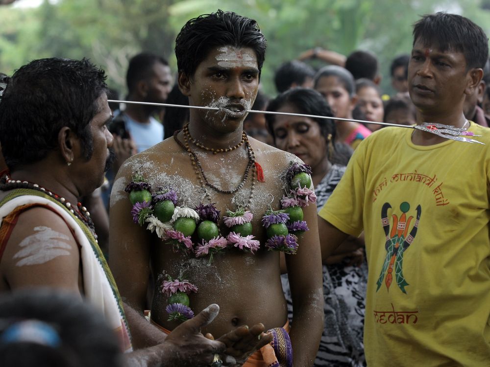 Tamil Hindu Indonesian man piercing the body with hooks and skewers as an offer prayers during Maha Puja celebrations Pangguni Uthiram in Shri Maha Murugen Temple, in Medan, North Sumatra, Indonesia on Sunday, March 22, 2015. Celebrations are held regularly every year is the month of greatness for Tamil Hindus believed to be the right day to remember the greatness of Lord Murugen or Muruga. Tamil Hindu descent celebrate this ritual, which is also used as a release ceremony vows as a form of gratitude to the creator and the hope of Indonesia to avoid distress to give up his body pierced with hooks and skewers.