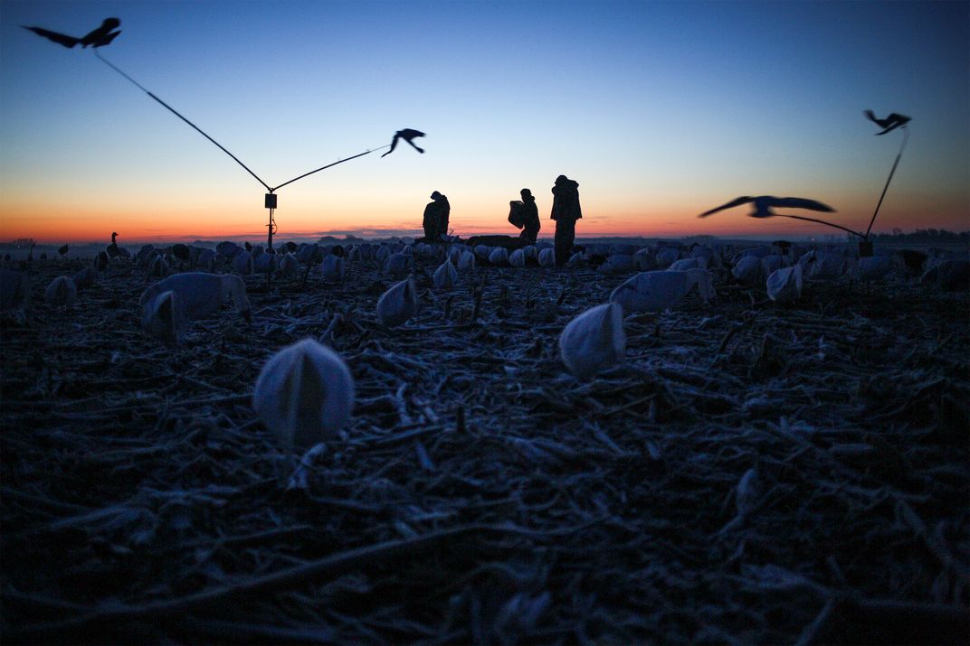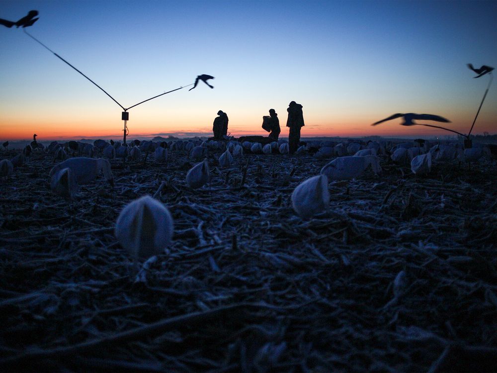 A group of snow goose hunters set up for their all day hunt before the sun rises.