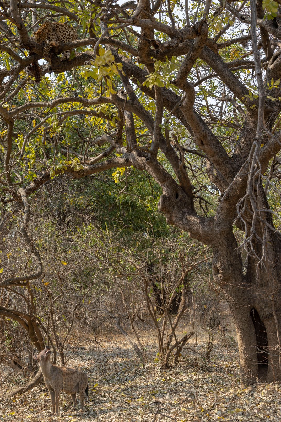 A leopard sits high in a tree, feeding on its kill. Down below a hungry hyena waits, hoping for scraps to fall. It’s a common sight in Africa, where leopards keep their meals safe from scavengers by hoisting them into the branches