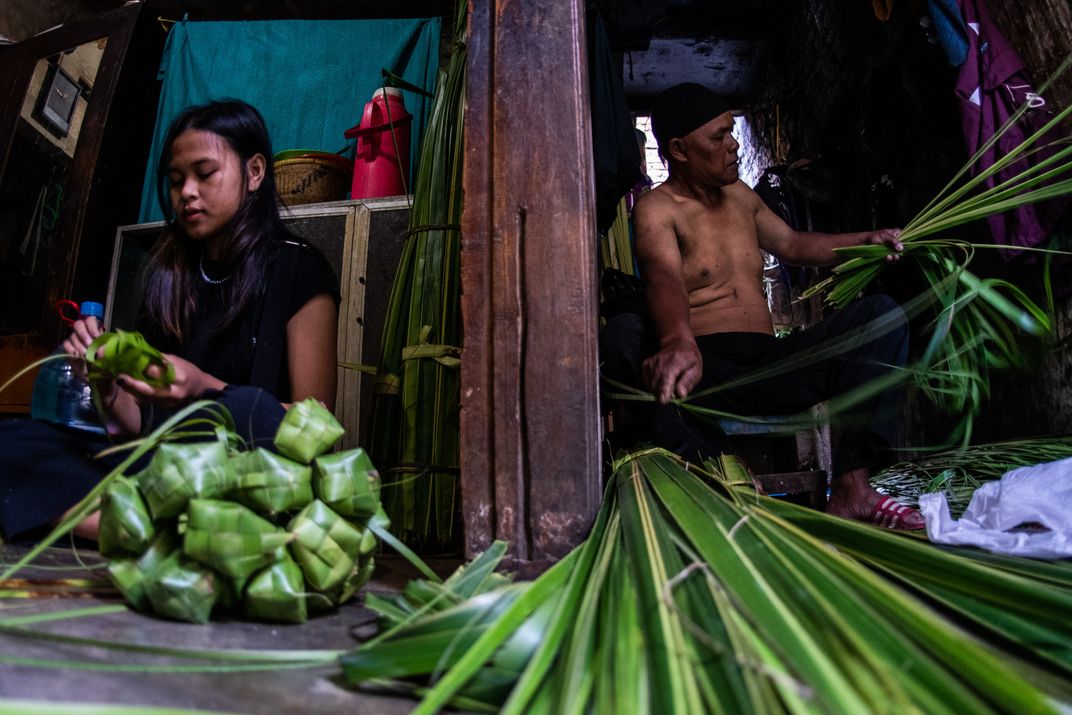 People make ketupat in preparation for Eid al-Fitr in Bandung, West Java, Indonesia, April 17, 2023. Ketupat is one of the traditional foods served during Eid al-Fitr in Indonesia.