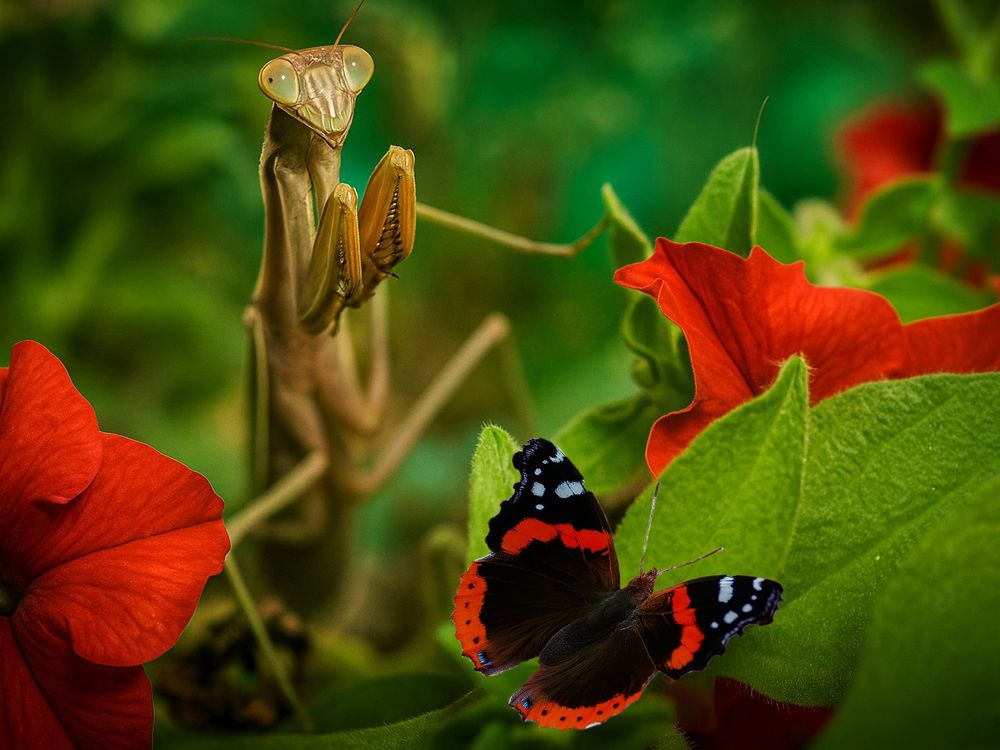 I was photographing a praying mantis in my petunia patch when a red admiral butterfly momentarily alighted on a leaf of the plant. It stayed long enough to catch the eye of the mantis and to give me a more interesting shot.