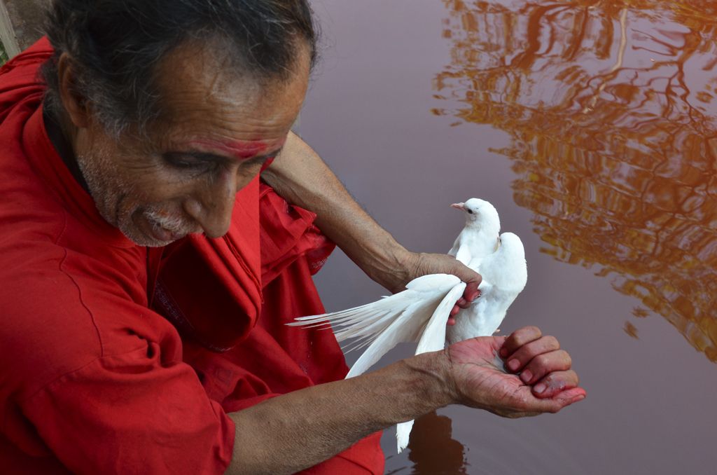 Priest blessing pigeons at the Kamakhya temple in Assam, India