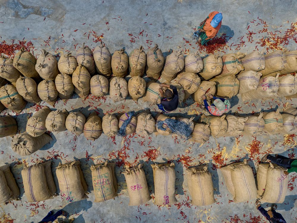 Dried chilies are being packed in sacks and sent to the factory for crushing and marketing.