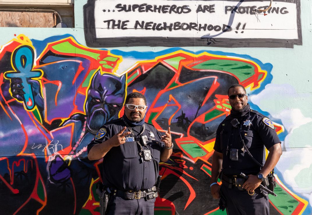 We were walking down the streets of San Francisco in June 2021, in the height of racial tensions following the George Floyd murder amidst calls to defund the police. We came across these 2 police officers just doing their jobs near a mural of superheroes. They agreed to pose for us as actual superheroes protecting the neighborhood.