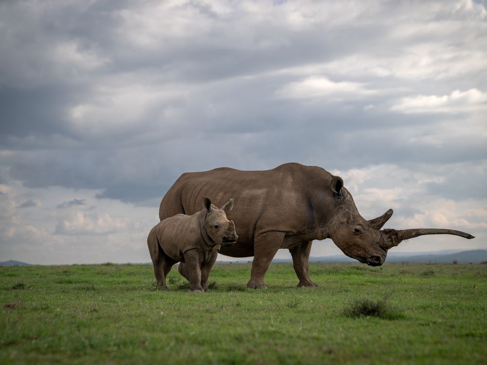 This young calf seems to be protective of its mother as they graze along the plains one afternoon in Kenya.