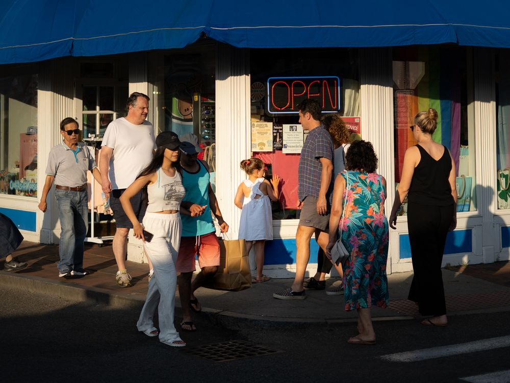 Pedestrians pass in front of a corner shop in Provincetown creating an interesting Tableaux. A young girl in a white dress stands in the center of the scene looking into the shop while adults make their way around her.