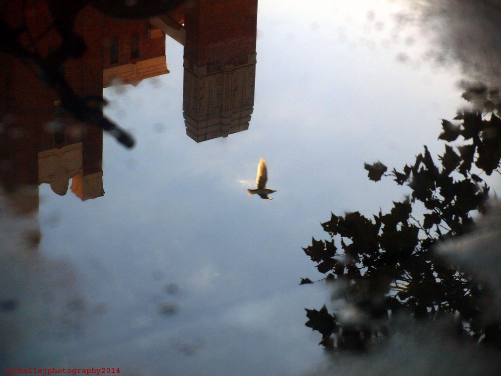 A puddle reflection of a bird with sunlight shining on it flying through!