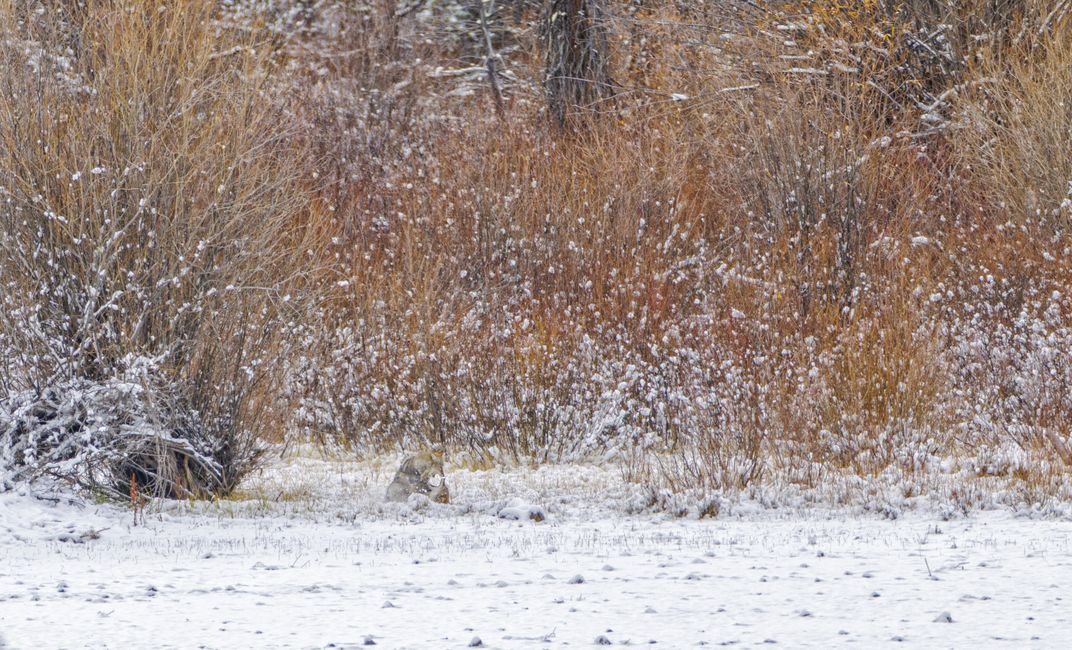 During a visit to Grand Teton National Park, I encountered two coyotes engaging in a lighthearted, open-mouthed tussle, batting at each other with their paws and rolling briefly in the powder.