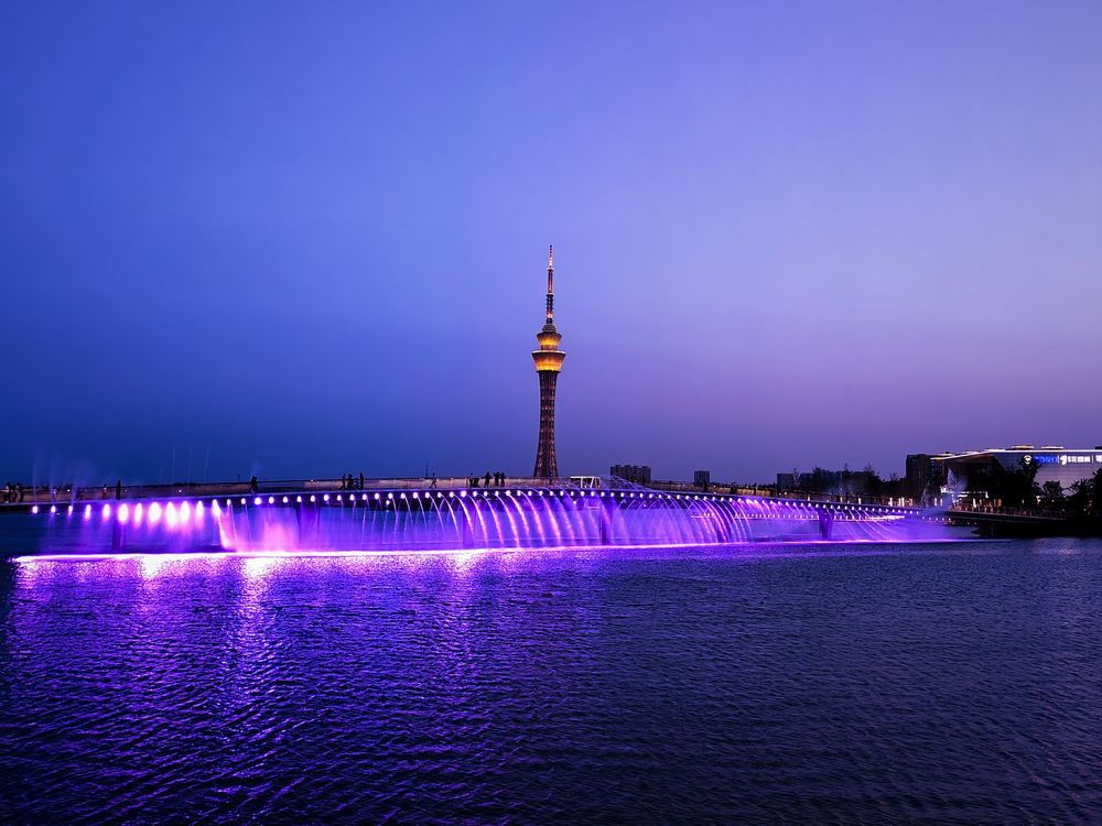 At Qinhu Park in Changshu, China, as night falls, the fountain show begins, and I captured a glimpse of the purple lake surface and sky.
