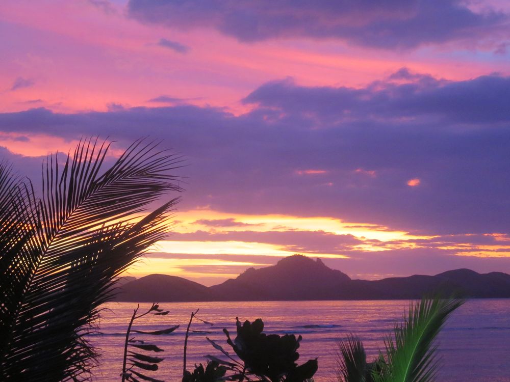 Experiencing an exotic, purple sunset over Tokoriki Island, Fiji.