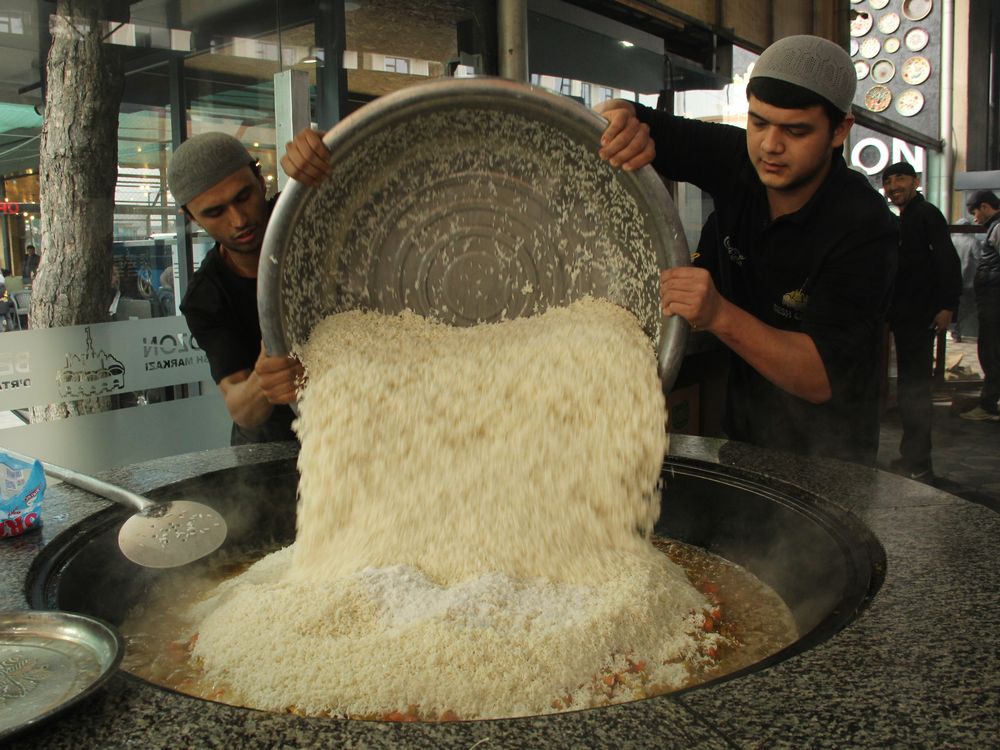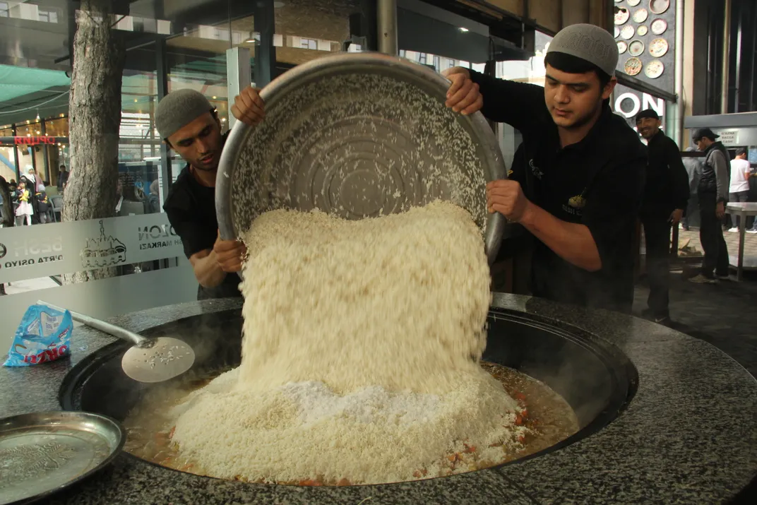 Cooking pilaf in a cauldron at a restaurant. Tashkent, Uzbekistan.
