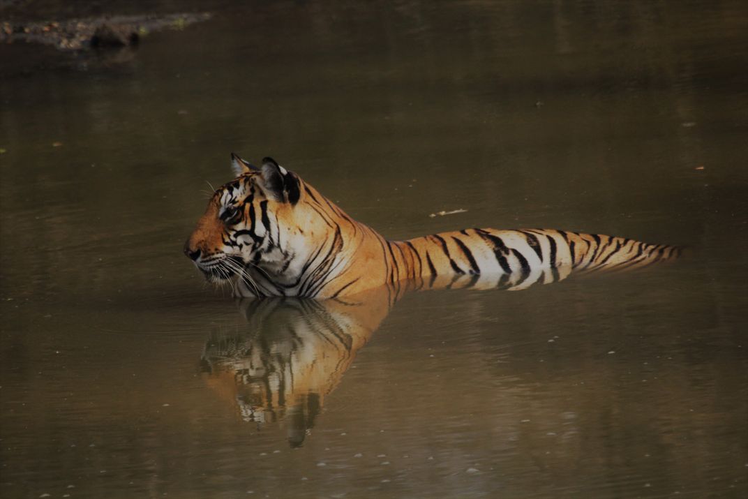 It was a hot summer morning and the waterholes inside the Nagarhole National Park were almost dry. We sat in a safari jeep by a waterhole waiting for to see if we could get lucky. Suddenly we hear the warning calls from the langur and deer. The naturalist said, ‘today could be our lucky day’ I was excited; could it be a tiger – I wanted it to be a tiger as I had never seen one in the wild and minutes later, this regal creature appeared from the bushes. She crossed the road and slowly walked into the small waterhole and sat there for a good fifteen minutes, enthralling us.