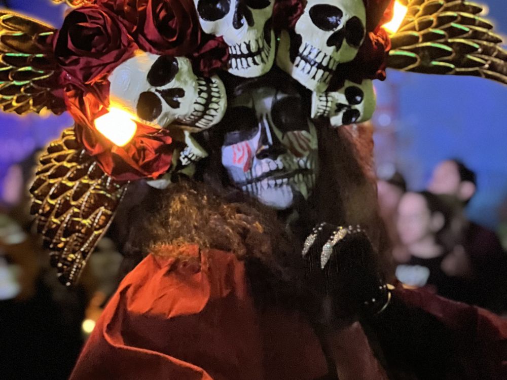 This striking photo captures a performer dressed as a queen of the dead during the vibrant Day of the Dead parade in Mexico City. The elaborate headpiece, adorned with glowing skulls and red roses, symbolizes the rich cultural tradition of honoring ancestors and celebrating the cycle of life and death. The intricate face paint and glowing lights bring a haunting beauty to the scene, perfectly blending artistry and spirituality.