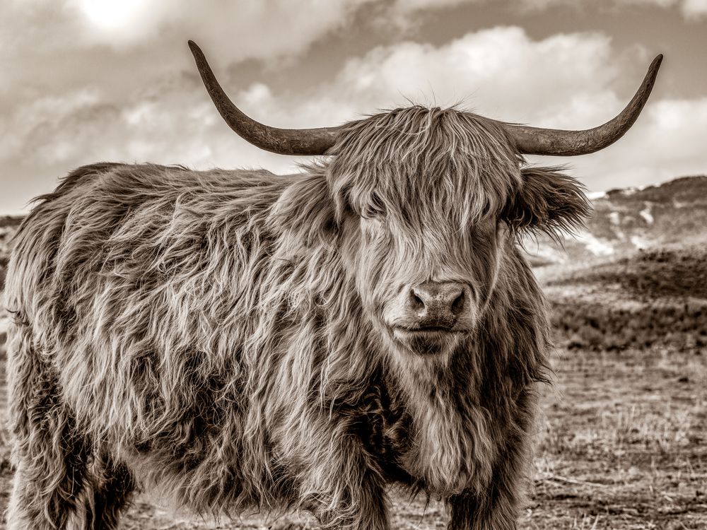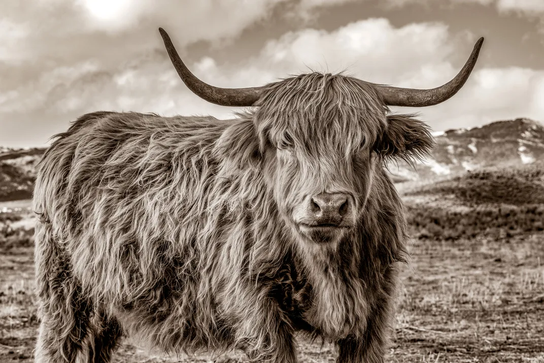 This sepia-toned image, "Queen of the Range," immortalizes a Highland Cow on Carey, ID's stark winter range. A portrait of raw beauty and resilience, her presence dominates the rugged, expansive landscape.