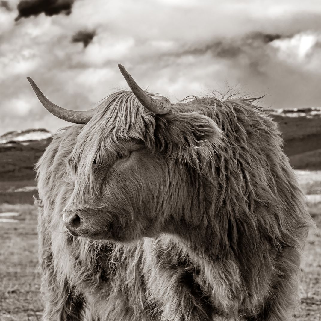 A beautiful, moody sepia profile of a Highland Cow under a dramatically clouded sky. With eyes gazing, the subject's posture and serene expression evoke a sense of deep meditation and enduring connection to the Idaho wilderness