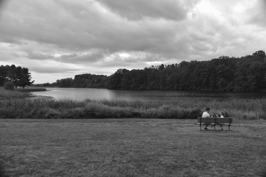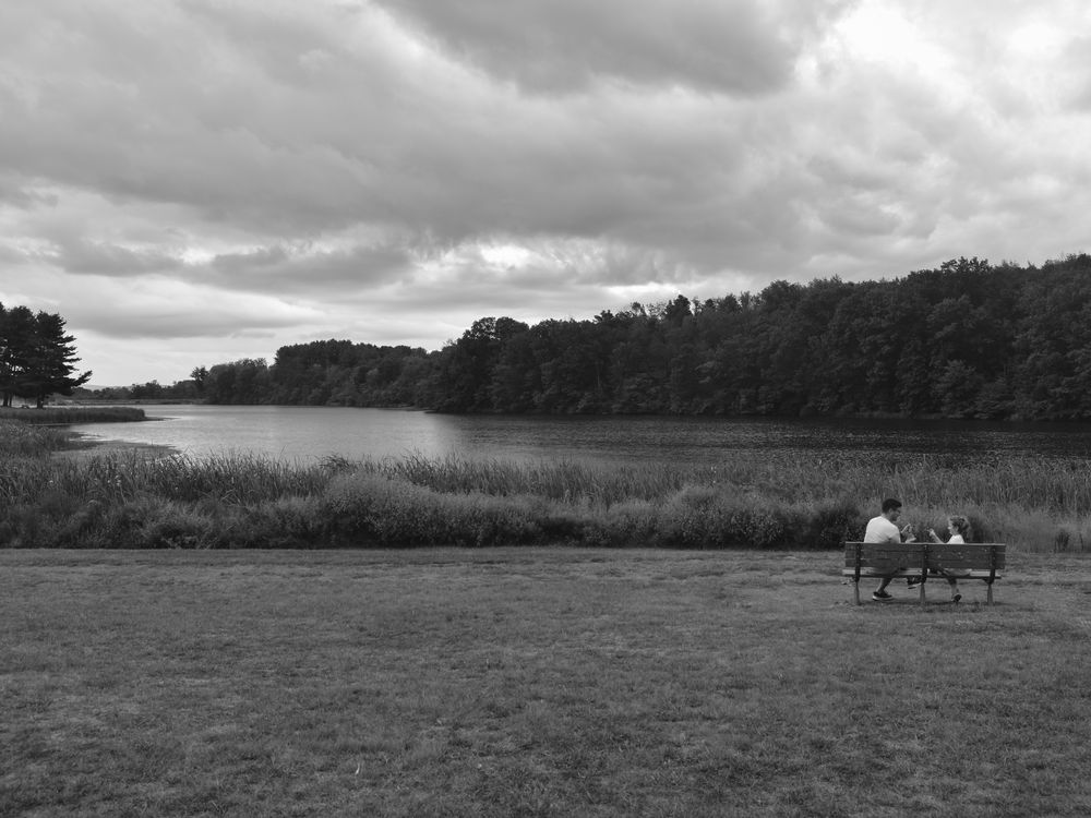 This photograph captures a quiet moment by a lakeside in Carlisle, Pennsylvania, where my husband and daughter sit together on a bench facing the water. The scene unfolds under an overcast sky, with dramatic clouds stretching across the frame while the lake remains calm. The black-and-white composition emphasizes the stillness of the landscape and the closeness between the two figures. The open space around them creates a sense of simplicity and reflection, turning an ordinary family moment into a peaceful and timeless scene.