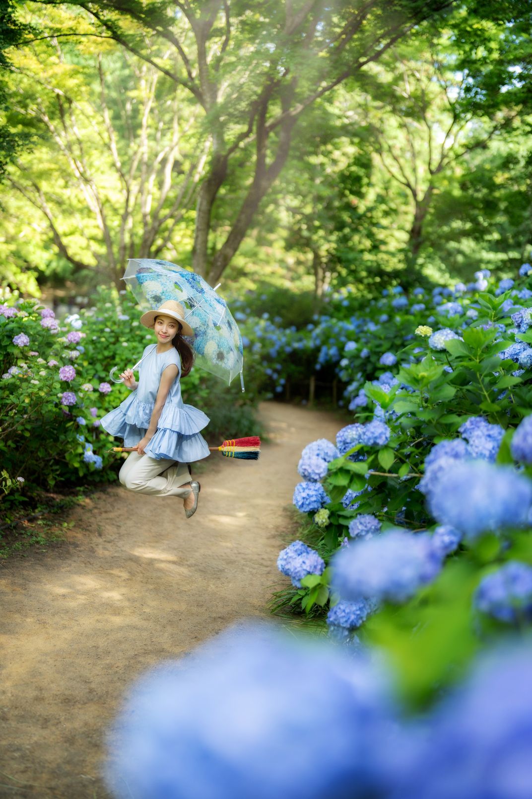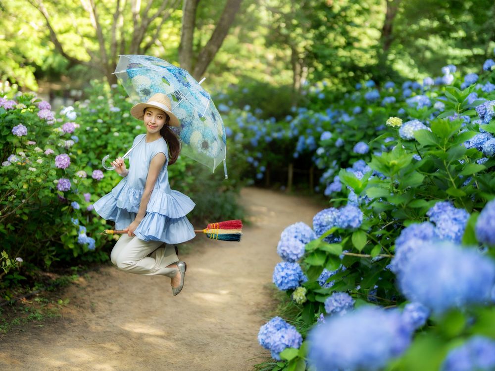 In Kobe Japan, Hydrangeas bloom brightest in the rainy season. In their calm, a gentle witch floats — her quiet magic rising with the flowers, celebrating the softness of June.