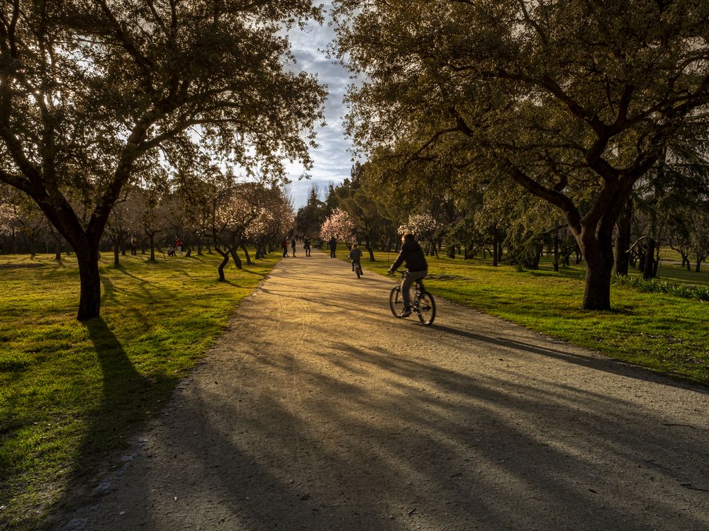 Parque de la Quinta de los Molinos, Madrid, in full spring bloom: delicate pink and white blossoms form a dreamlike canopy, turning the park into a serene oasis. Amid the bustle, offering tranquil color and seasonal renewal, joy and natural splendor.