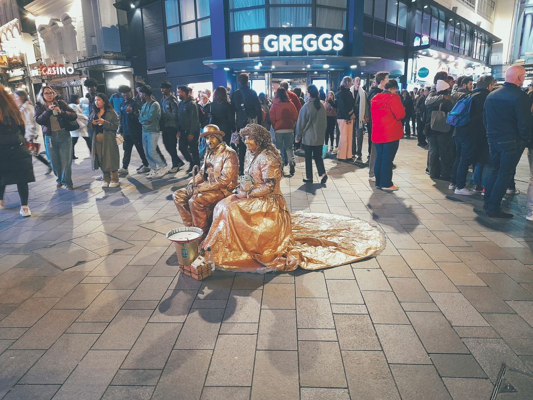 The photograph shows a couple draped in gold who perform as living human statues seated in front of Greggs, a restaurant that has become closely identified with British culture.