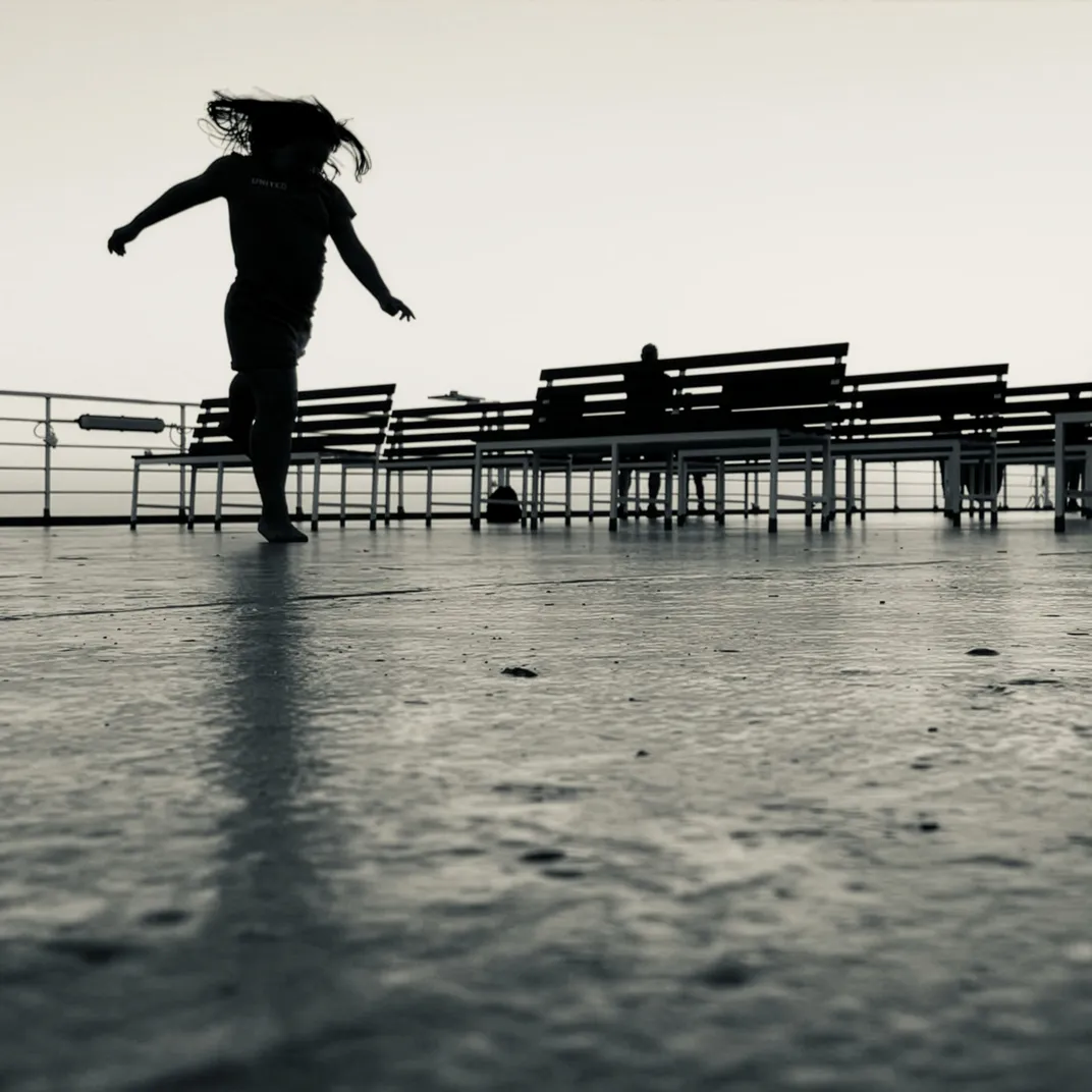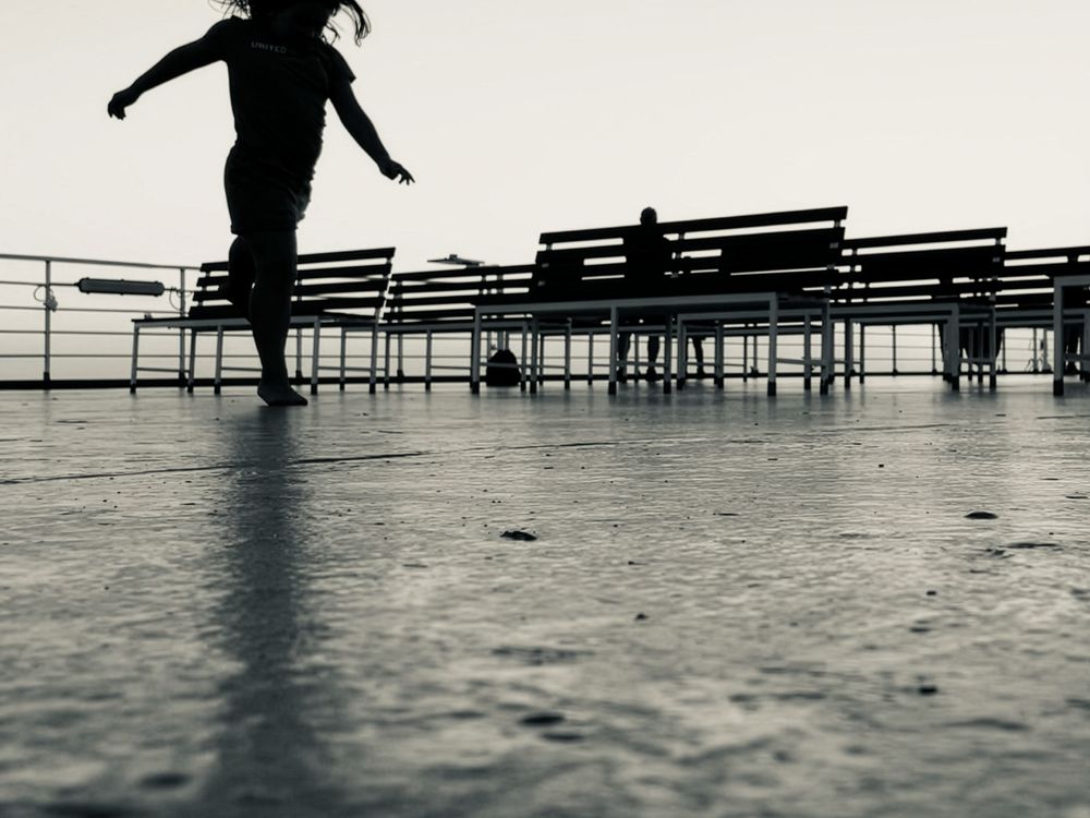 A very contrasting photo, the sense of movement is given by the girl's hair. I was also interested in the texture of the ship's deck.