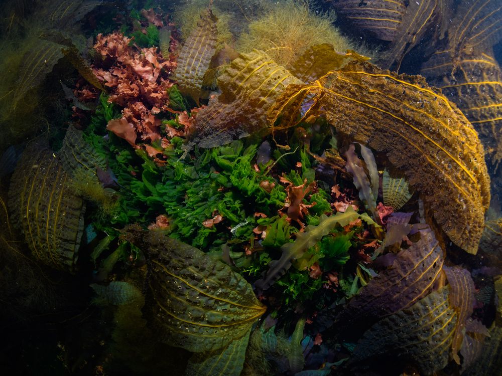 I photographed seaweeds (Ulvophyceae, Phaeophyceae, Phodophyta) growing in the cold, shallow waters of the Far East in winter. While the quiet land and dark rocks above were covered with snow, the sea below was filled with vibrant, colorful algae.