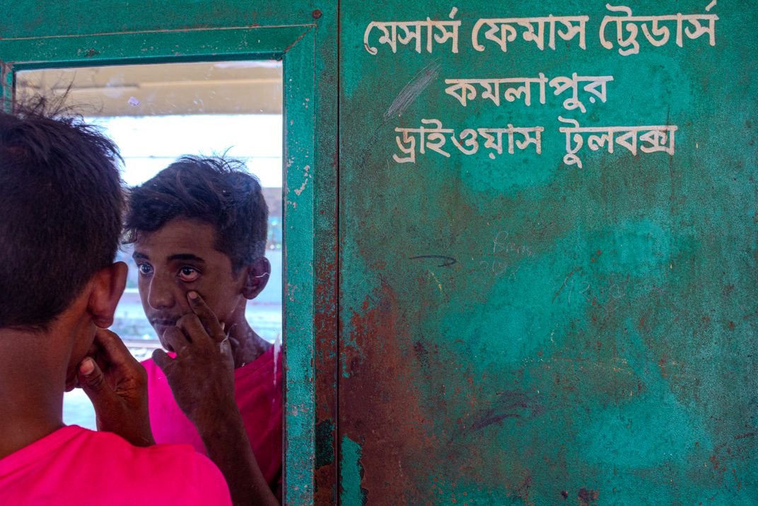 A young railway porter in a vibrant shirt pauses at a "Komlapur" station, his face caught in a moment of deep reflection within a grimy, scratched reflective surface. The stark contrast between his hopeful attire harsh realities of life for those whose existence is a relentless cycle of loading and unloading for meager pay. This portrait is a poignant glimpse into the unseen toil and unfulfilled dreams of the working class.