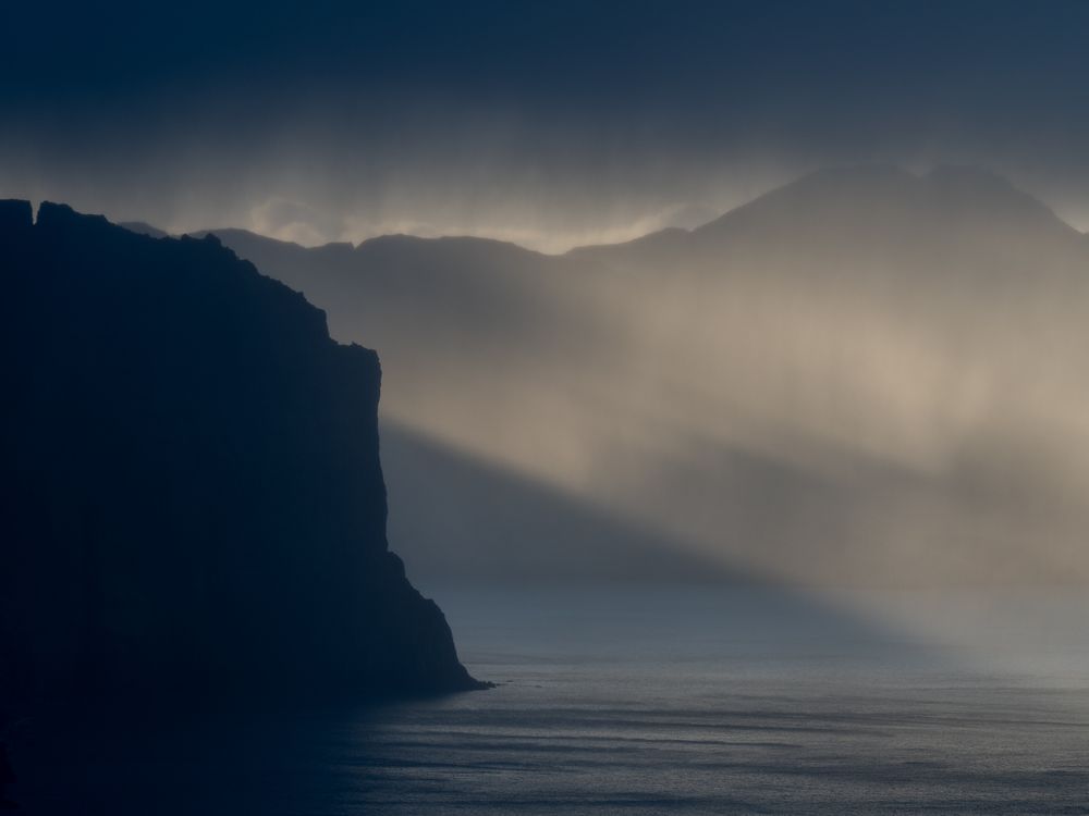 The last rays of sun striking through low hanging rain clouds above Vágar island. Faroe islands, 2025