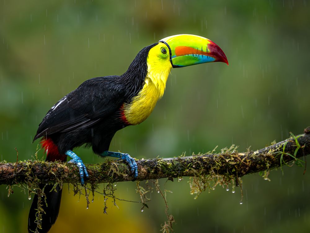 A vibrant toucan perches on a mossy branch in the rain, its colorful beak glowing against the misty rainforest backdrop as droplets cling to its feathers.
